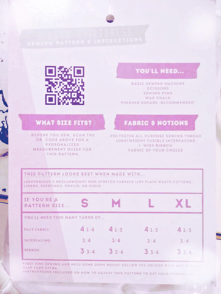 Back to the card...on the reverse there is a list of supplies and notions needed for the project ahead of you. There's something that's probably immediately noticeable, and that's the big QR code in the corner there. That's your sizing guide! You're probably wondering how this works, so I'll walk you through it.