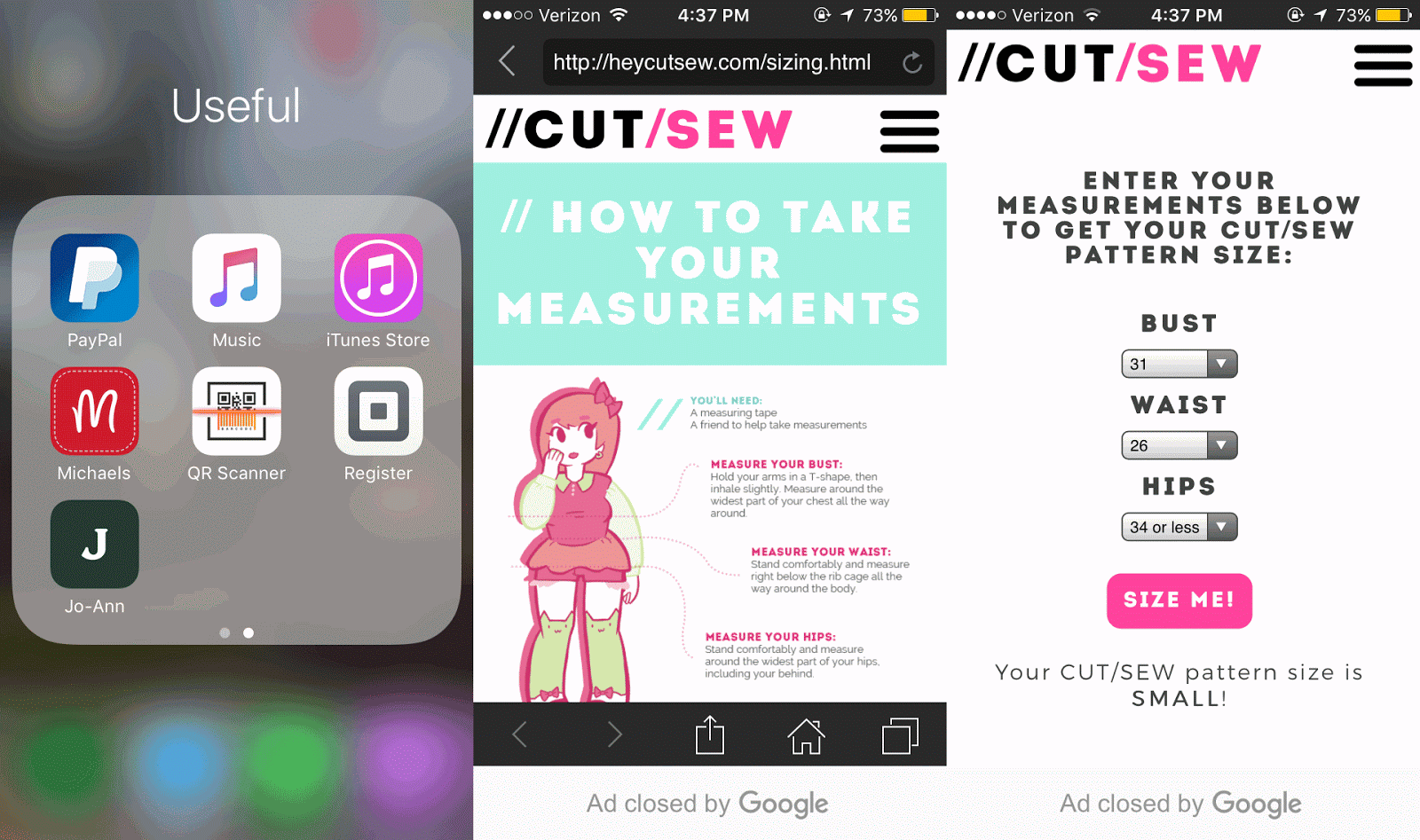 However, Hey Cut Sew makes it a lot simpler. I downloaded a free QR scanner (which had ads, but what can you do) and it brought me to a page with a handy guide on how to take measurements, and then a dropdown menu where I could enter in my measurements. Once I did that, it told me in no uncertain terms what size pattern I should use, simplifying my life quite a bit and saving me some time.