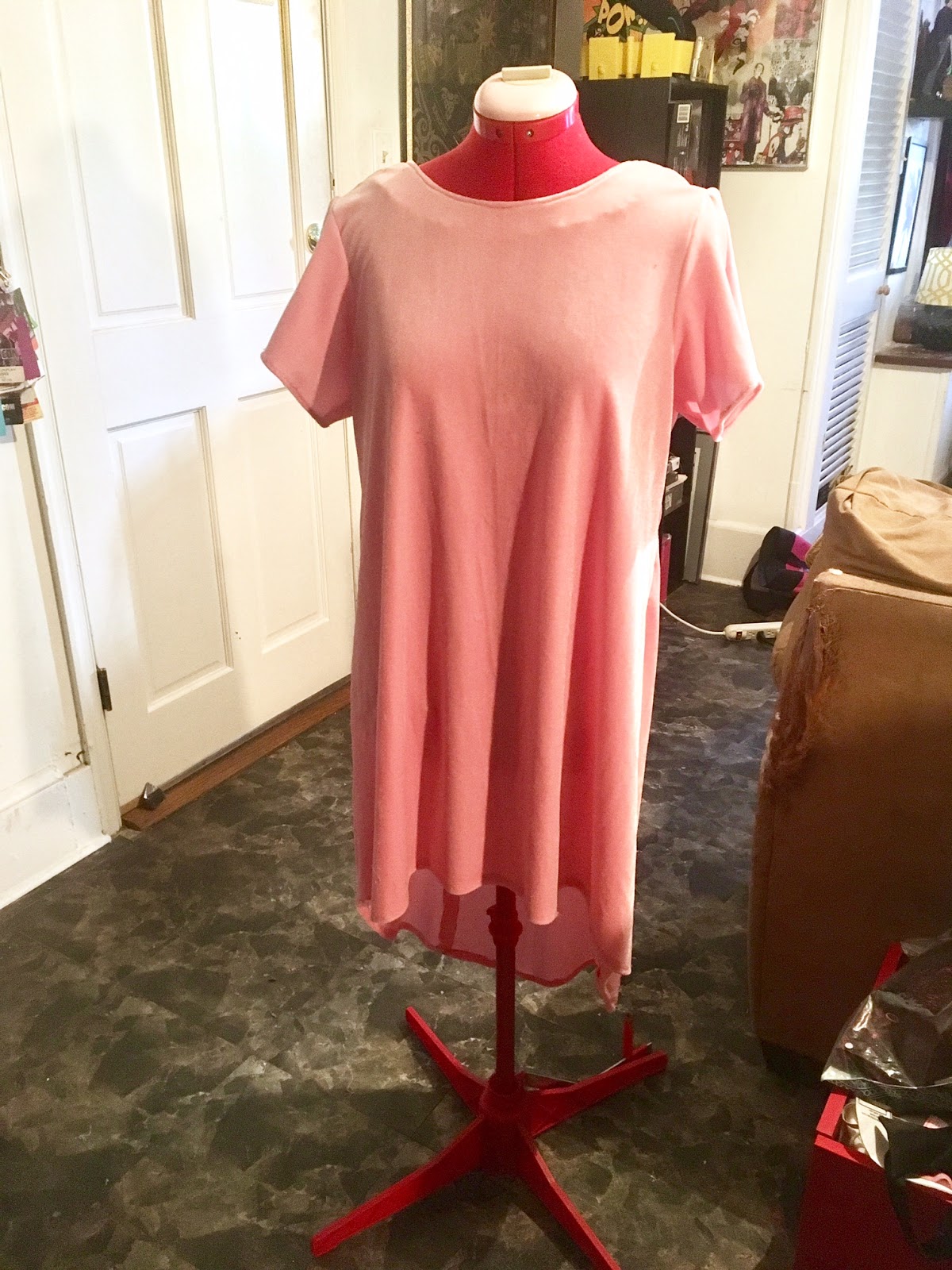 If I may take a minute to talk about my experience making the dress outside of the pattern, I decided to make the dress out of velvet. NOTE: Velvet is definitely not one of the suggested fabrics for this pattern! I wanted to take a stab at playing with a simple, casual pattern and trying to find a way to dress it up a bit, and thought using something like velvet was a good way to do that. I also knew I was going to be attending a holiday party in about a week, and thought it would be fun to wear the dress to a fancyish party. However, I'd never sewn velvet before, and it was definitely trickier than I expected! Many of the setbacks I experienced were due to me being a velvet noob.