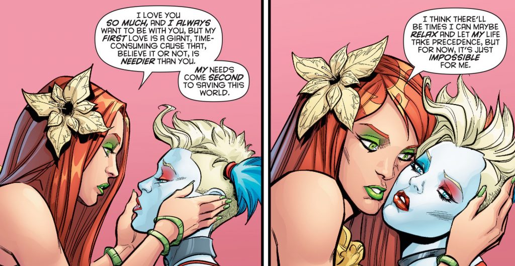 He attacks her, forcing himself on her, and she bites his lip, leaving him bleeding on the floor and stating she will never follow his demands again. Many fans liked this, as it demonstrated her ability to overcome abuse and gave her growth beyond being a subsidiary character to Joker. Issues followed in which Harley and Ivy are shown solidifying their relationship, with Harley asking to become something consistent. This story was done over several issues, and the answer from Ivy delayed by a story of their vacation adventures. Finally, she states that she can’t commit, because of her responsibility to plants. Really.