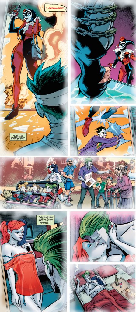 I have not read the complete series of The New 52, now Rebirth, the Amanda Connor and Jimmy Palmiotti Harley Quinn, but not for lack of trying. I find their stories inconsequential and shallow, and feel that the character they are working with now, that their continued storytelling has created, has little similarity to the 25-year-old character that shares it’s name. However, this is not to say that Harley Quinn cannot survive on her own without The Joker, a choice that much of these stories works with, or that she cannot hold her own in a title of her own. Her early 2000s series and Gotham City Sirens both demonstrate otherwise. Any reader, fan base included, who claims that stories involving this character needn’t or shouldn’t have depth are simply incorrect. Characters change and evolve, but this character isn’t only dissimilar to what she had been but has been stripped of what one would consider character. Removing her of larger, more worthwhile conflict has created mostly a vehicle for jokes and innuendo that is great for selling products and looking good on covers. Outside of character issues, I find the writing in itself difficult to follow. I won’t make sweeping statements; most of these critiques are reflected in the recent issues that I want to comment on. All of this said, let’s focus on the most recent issues of the series that offer a carrot to fans of the origins of the character and a possible relationship with Joker. I tuned-in and read the series when there is a story being told that interests me. Recently, the series has courted fans who want to see Harley in a more consistent relationship that reflects her history, grounding her in her roots between Joker and Poison Ivy that were cemented in Batman: The Animated Series. A few panels went viral and created discussion and debate when Harley seemed to finally answer the will they/won’t they with Joker.